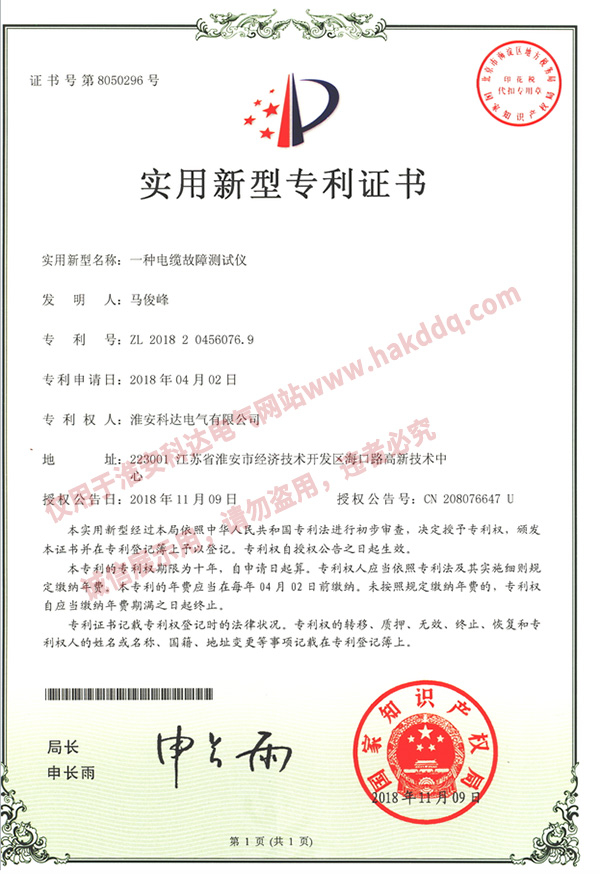 電纜故障測(cè)試儀專利證書